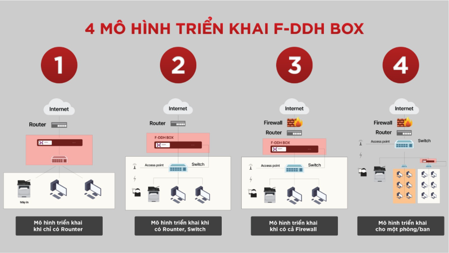 Tùy theo cấu trúc hệ thống, F-DDH Box có thể triển khai theo nhiều mô hình khác nhau như: triển khai trong hệ thống chỉ có Router, hệ thống có Router và Switch, hệ thống có cả Firewall để bổ sung lớp kiểm soát dữ liệu đầu ra trong mô hình bảo mật nhiều lớp, hoặc triển khai riêng cho từng phòng, ban hoặc khu vực mạng nội bộ độc lập.